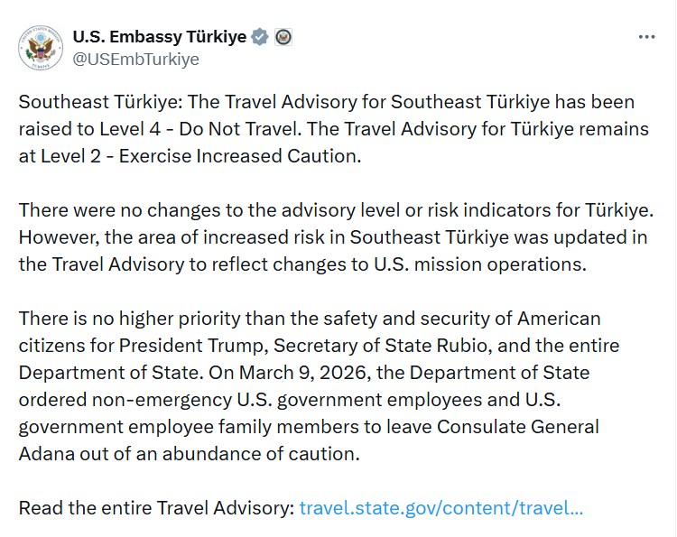 Öte yandan ABD yönetimi, Adana’daki konsolosluk için de yeni bir karar aldı. Yapılan açıklamada, 9 Mart 2026 itibarıyla acil görevi bulunmayan ABD hükümeti personeli ile aile üyelerinin ABD Adana Konsolosluğu’ndan ayrılması talimatının verildiği ifade edildi.